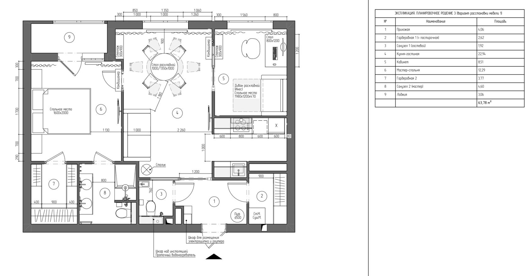 Итоговый проект модуля: Дизайн-концепция и чертежи двухкомнатной квартиры с тремя вариантами планировки по реальному брифу.