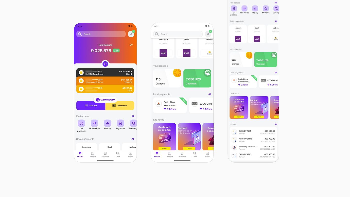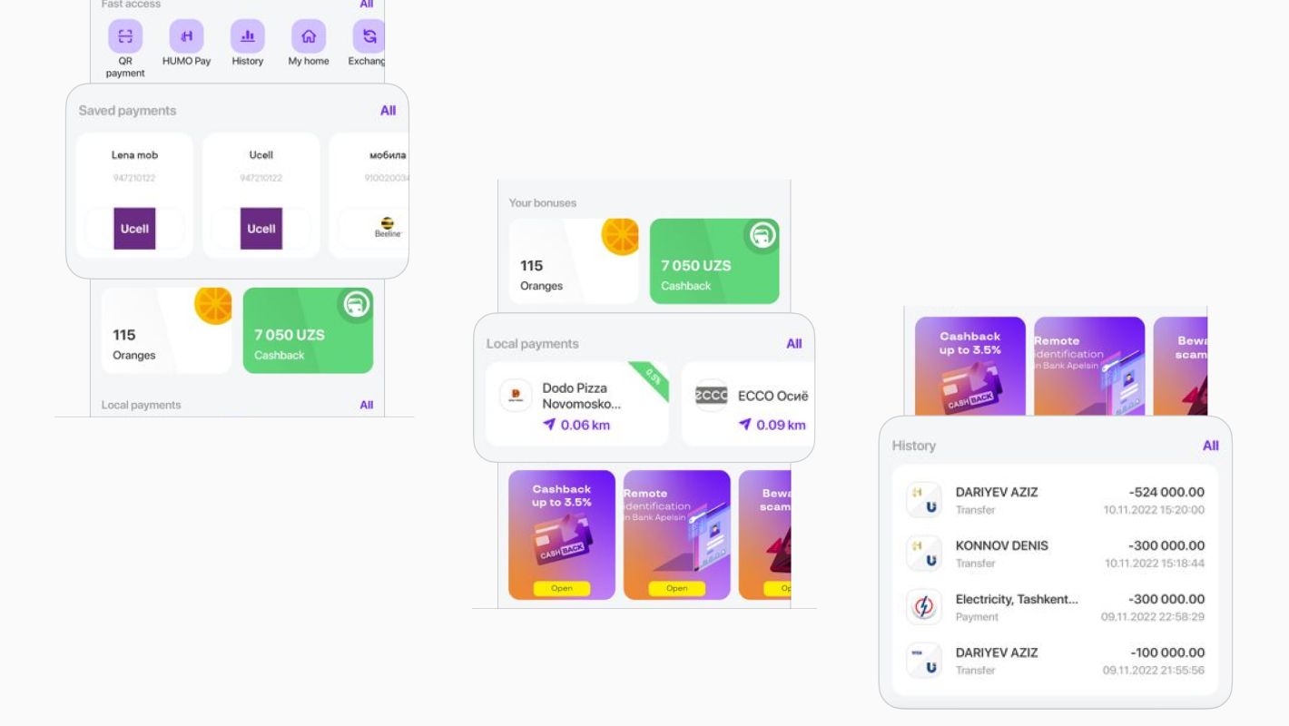 - Явная кнопка скрытия баланса была самой частотной функцией на экране, потому что на рынке Узбекистана нет Apple и Google Pay, а большая часть оплат происходит с помощью сканирования QR-кода через приложение банка. Люди часто открывают приложение в публичных местах и не хотят, чтобы кто-то случайно увидел баланс.