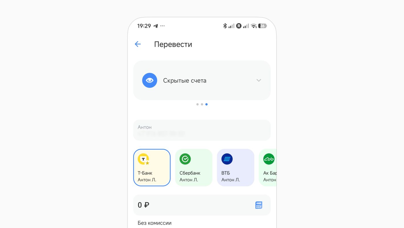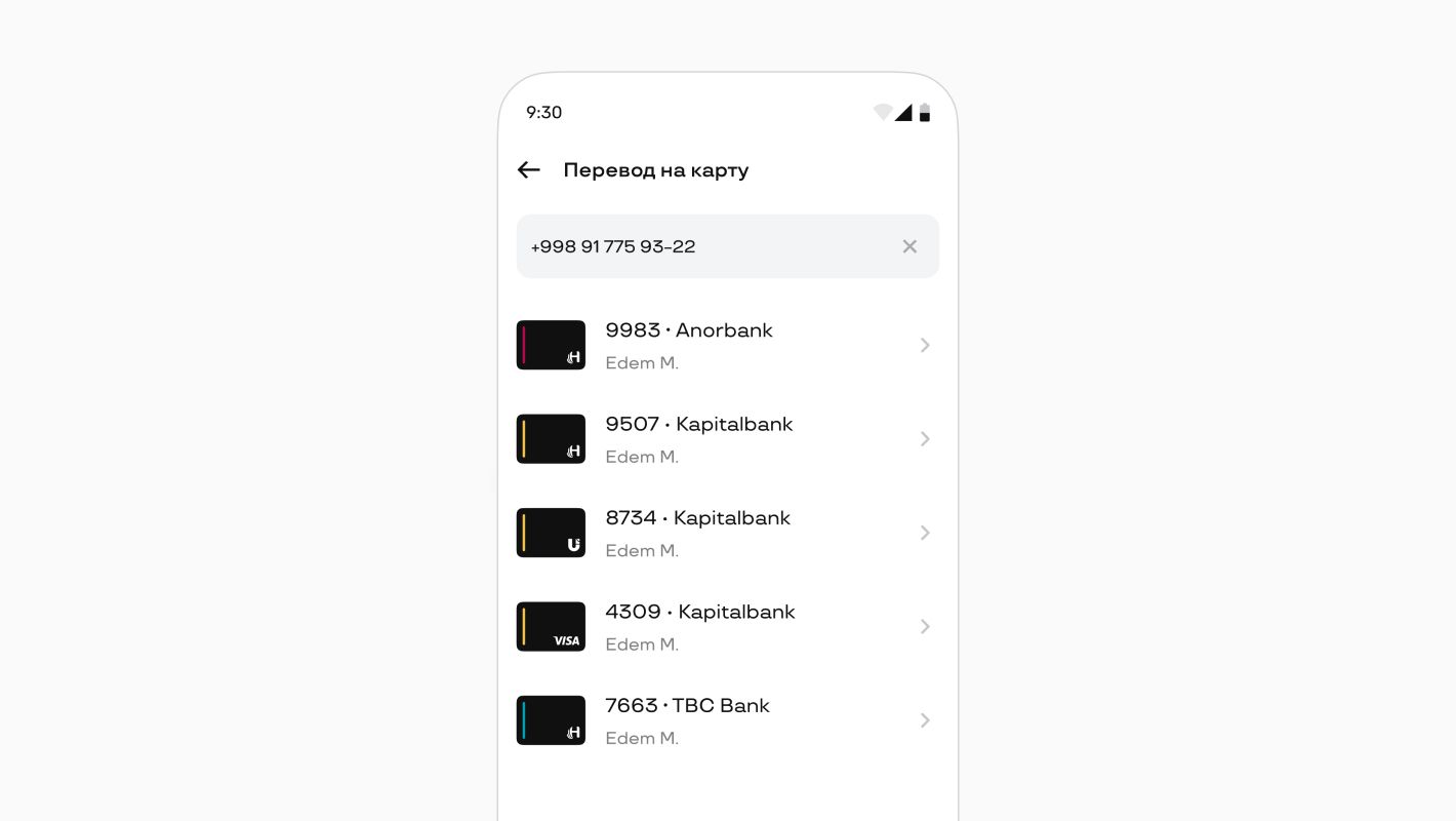 Уже на этапе проектирования интерфейса мы поняли, что у нас так не получится. Местные банки работают по логике «одна карта — один счет», а у людей зачастую несколько карт в одном банке, большая часть из которых уже не используются, но еще открыты. Многие открывают карты в разных банках, охотясь за лучшими условиями по переводам и кешбэку. И получается, что когда пользователь пишет номер телефона, он видит такую картину: